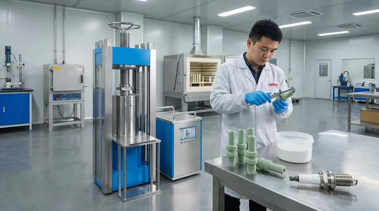 Bei der Herstellung von Zündkerzenisolatoren ist das kaltisostatische Pressen (CIP) der entscheidende Fertigungsschritt, mit dem hochreines Aluminiumoxid-Keramikpulver gleichmäßig zu einem dichten, festen Rohling verdichtet wird. Dieses anfängliche „grüne“ Teil hat die Konsistenz von Kreide, was eine präzise Bearbeitung vor dem Brennen im Ofen ermöglicht, um den endgültigen, extrem harten und langlebigen Isolator herzustellen.
